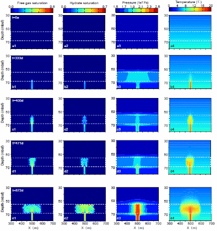 該研究還表明上覆泥層中二次水力壓裂的發生,須具備特定的超壓與氣體供給條件(圖3)。當較低的甲烷通量在進入砂層后迅速形成天然氣水合物,導致孔隙堵塞、滲透率降低,從而引發自封閉效應。該過程抑制了氣體向上部的輸運,致使砂層頂界孔隙壓力無法有效累積至破裂壓力臨界值。這一機制很好地解釋了實際地質現象:盡管部分砂層下伏氣煙囪結構發育,但其對應上覆地層中并未形成貫穿至海底的氣體逸出路徑。原因在于低通量條件下氣體運移路徑被天然氣水合物阻斷,超壓體系未能充分發育,達不到泥巖破裂所需的最小壓力條件。
