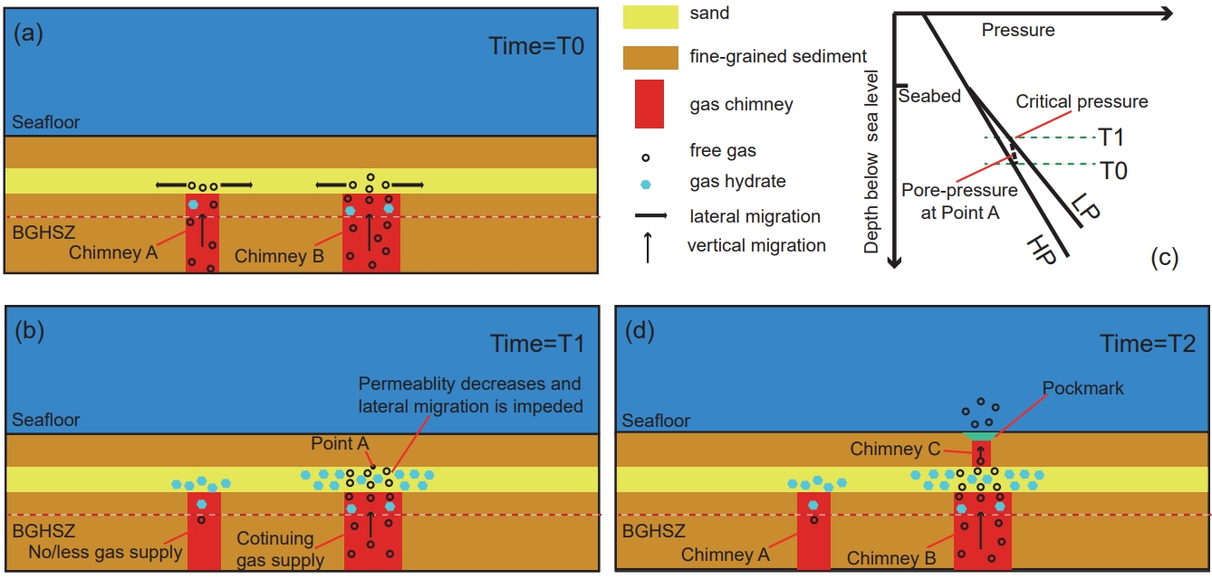 研究發現,砂層在整個過程中扮演了極其重要的角色(圖2):(1)捕獲與富集:砂層首先攔截了下伏氣體煙囪的向上延伸,并將深部遷移來的甲烷氣體“捕獲”在自己體內。在高壓低溫的環境下,這些氣體與水結合形成可燃冰,富集于砂層的孔隙中。(2)阻礙與增壓:天然氣水合物往往差異聚集,它們會優先在某些部位大量生成,堵塞砂層的孔隙,形成“自封蓋”效應。此時,后續源源不斷的甲烷氣體被封堵在下部,導致其壓力逐漸積聚。(3)水力壓裂與逃逸:當被封閉的氣體壓力(超壓)大到足以突破上覆泥質蓋層的束縛時,便會在上覆泥巖蓋層中發生二次水力壓裂。這股強大的壓力會突破上覆的細粒低滲沉積物,形成一個新的、直達海底的氣體煙囪,從而開啟新一輪的氣體逃逸和冷泉活動。